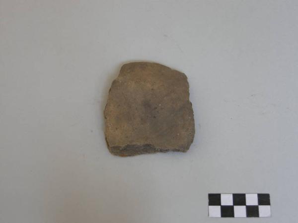 Frammento di fondo, pertinente probabilmente a scodella, prodotta con ceramica d'impasto finemente depurata con minuti inclusi micacei, color grigio, e superficie lisciata. Presenta una decorazione costituita da 4 fasci di 3 solcature, disposti in maniera radiale, convergenti al centro in una impressione circolare.