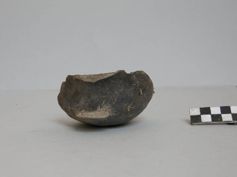 Tazza a corpo careanto, prodotta con ceramica d'impasto mediamente depurata con inclusi litici e micacei, color grigio, avente orlo arrotondato, esoverso, parete distinta, concava e vasca a calotta. Rimangono gli attacchi dell'ansa che era impostata sull'orlo.