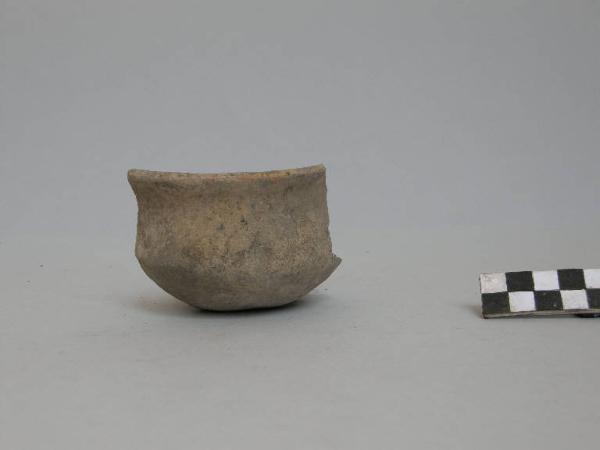 Tazza a corpo careanto, prodotta con ceramica d'impasto mediamente depurata con inclusi litici e micacei, color grigio-marrone, avente orlo arrotondato, esoverso, parete distinta, concava e vasca a calotta.