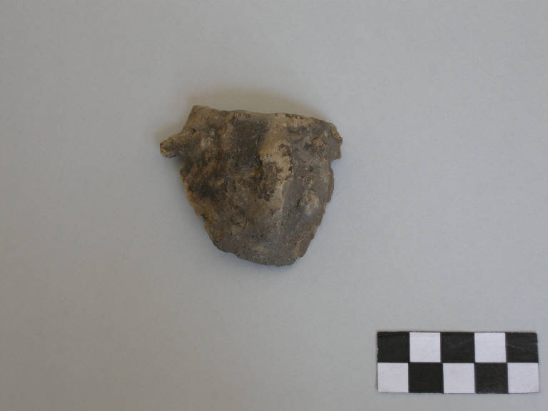 Frammento di orlo e parete, pertienente a ciotolina, prodotta con ceramica d'impasto mediamente depurata con inclusi litici e micacei, color grigio, avente orlo piatto e fondo piano. L'ansa, di piccole dimensioni, è del tipo a tunnel, ed è impostata sotto l'orlo. Sulla parete si notano due bugne plastiche una sotto l'altra, a destra dell'ansa e una lieve solcatura a sinistra.