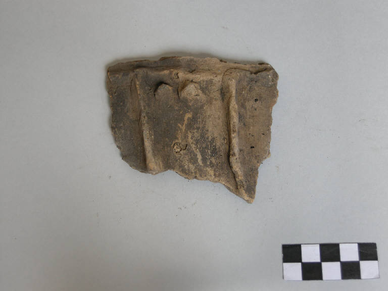 Frammento di parete, prodotta con ceramica d'impasto grossolana con inclusi litici e micacei, color grigio chiaro. Presenta una decorazione costituita da un cordone orizzontale e due verticali che delimitano un'area rettangolare al cui interno si trovano due bugne.