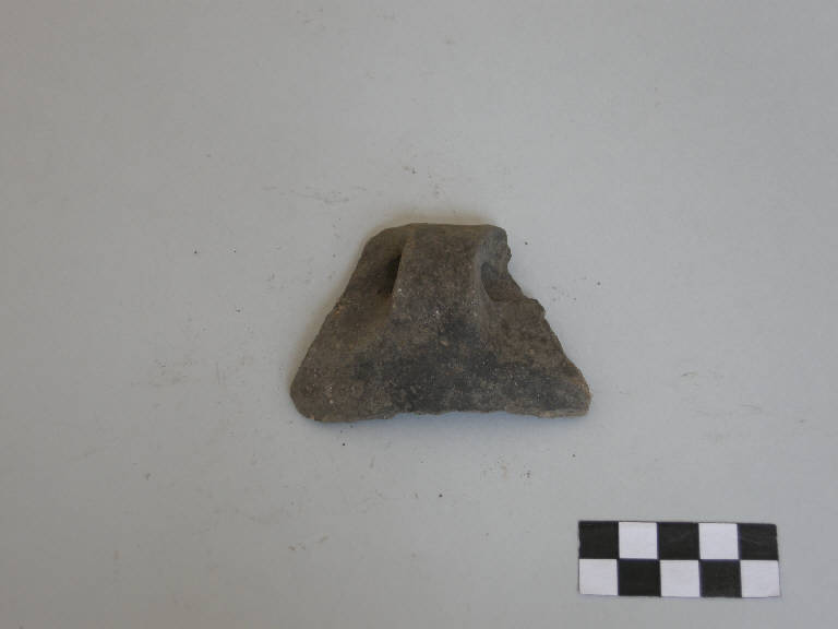 Frammento di parete con ansa, pertinente a scodella, prodotta con ceramica d'impasto finenmente depurata con minuti inclusi litici e micacei, color grigio, avente orlo arrotondato. L'ansa è di tipo a tunnel.