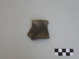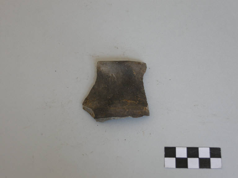 Frammento di parete, pertinente probabilmente a boccale a corpo carenato, prodotto con ceramica d'impasto mediamente depurata con inclusi litici e micacei, color grigio, avente orlo arrotondato, esoverso e parete distinta lievemente convessa.