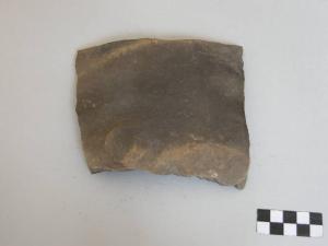 Frammento di orlo e parete, pertinente a vaso a corpo tronconico, prodotto con ceramica d'impasto mediamente depurata con inclusi litiici e micacei, color grigio, avente orlo piatto. L'ansa è del tipo a bottone.
