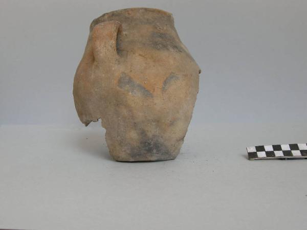 Anfora a corpo biconico, prodotta con ceramica d'impasto mediamente depurata con inclusi litici e micacei, color grigio, avente orlo piatto, esoverso, profilo sinuoso e fondo piano. L'ansa, del tipo a gomito, è impostata sotto l'orlo.