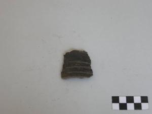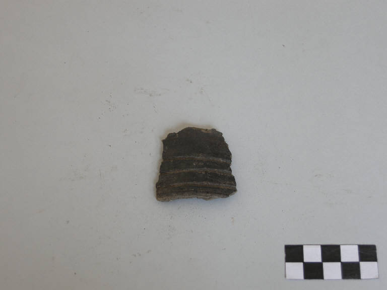 Scodella con corpo a calotta monoansata, prodotta con ceramica d'impasto finemente depurata con minuti inclusi micacei, color grigio, avente orlo arrotondato e fondo piano. L'ansa, del tipo nastriforme ad anello, è impostata sotto l'orlo.