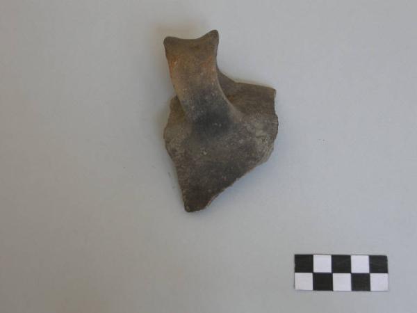 Frammento di orlo e parete, pertiente a capeduncola, prodotta con ceramica d'impasto mediamente depurata con inclusi litici e micacei, color grigio, avente orlo piatto, parete distinta rettilinea e vasca a calotta. L'ansa, del tipo ad orecchi con appendici sopraelevate, è impostata sull'orlo.