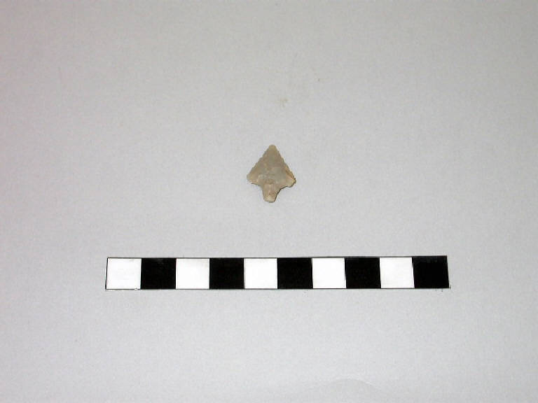 Punta di freccia foliata a peduncolo e alette in selce grigia con ritocco coprente bifacciale.