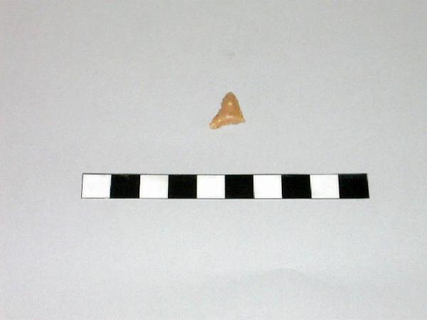 Punta di freccia foliata a faccia piana, asimmetrica, in selce color beige.