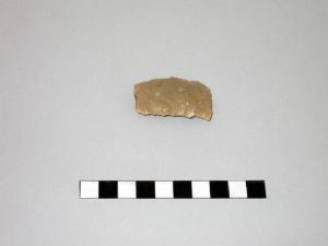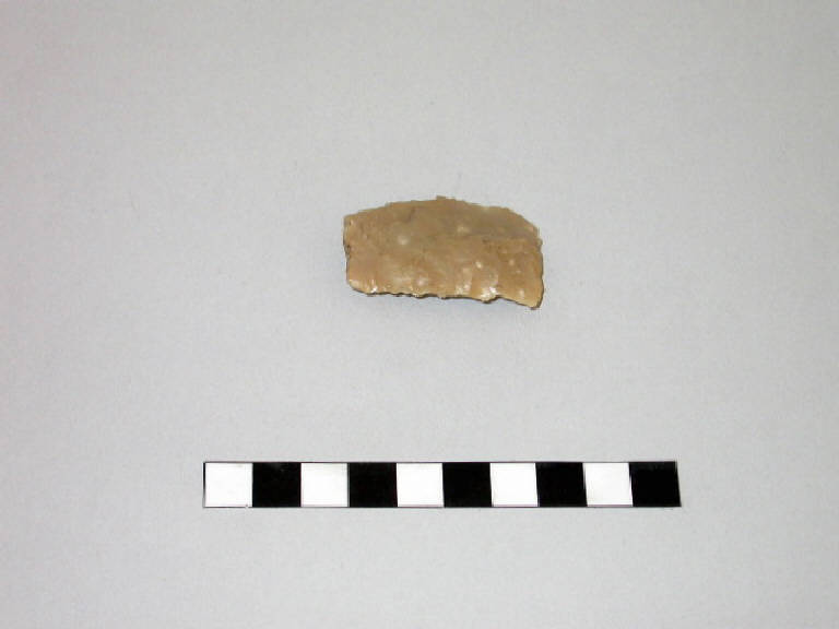 Raschiatoio foliato in selce di colore beige, con usura stralucida, utilizzato come elemento di falcetto.