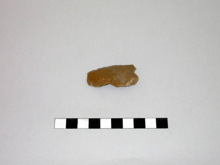 Raschiatoio foliato in selce di colore marrone-rossastro, con usura stralucida, utilizzato come elemento di falcetto.