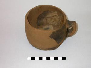 Boccale a corpo cilindrico e fondo piano, con ansa a gomito.