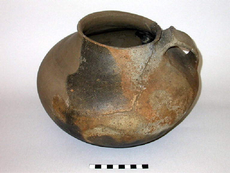 Vaso a collo troncoconico e corpo espanso, con ansa ad ascia a taglio arrotondato e fondo piano.
