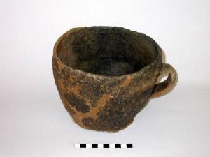 Boccale troncoconico con ansa a gomito e orlo decorato a tacche. presenta tracce di fuoco e incrostazioni carboniose.