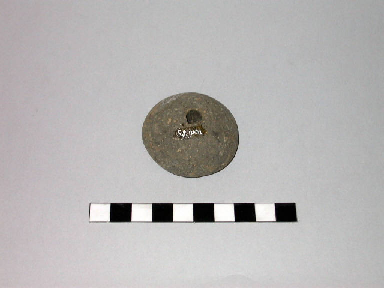Fusaiola in terracotta di forma troncoconica a base concava.