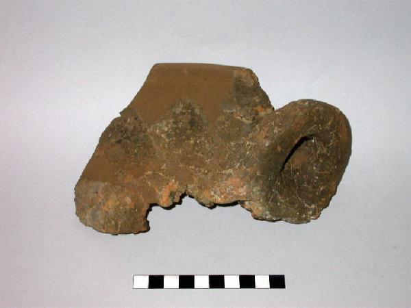 Olla con orlo piatto, labbro leggermente esoverso e maniglie all'altezza della spalla.
