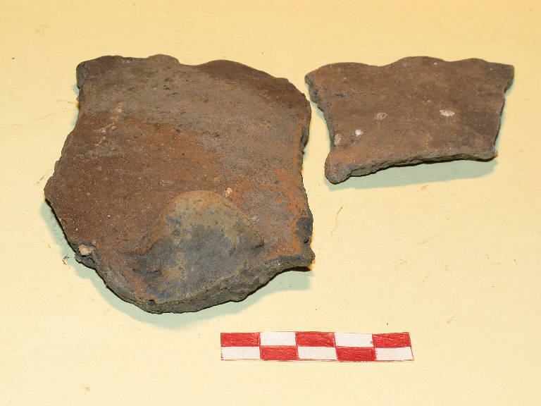 2 Frammenti pertienti a vaso troncoconico, prodotto in ceramica di impasto mediamente depurata, avente orlo ondulato con impressioni, e presa a linguetta sulla parete.