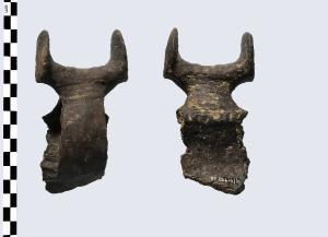 Frammento di ansa con sopraelevazione lunata ed espansioni verticali a profilo circolare, pertinente a capeduncola, prodotta in ceramica d'impasto grossolano, color grigio, e superifici lisciate, avente una decorazione costituita da 5 solcature sull'insellatura, 4 orizzontali sotto e 6 tacche all'interno della vasca; inoltre sono presenti 3 solcature orizzontali sul nastro esterno.