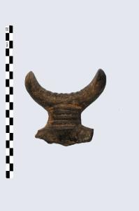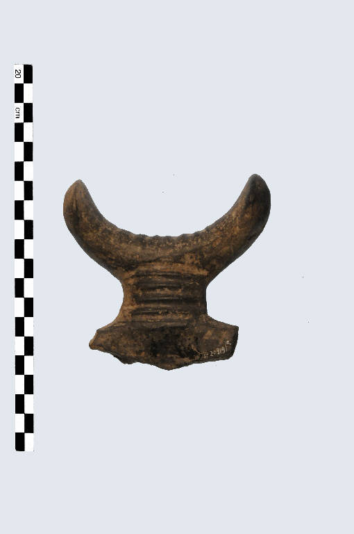 Frammento di ansa con sopraelevazione falcata ed appendici spatuliformi in visione laterale, pertinente a capeduncola, prodotta in ceramica d'impasto grossolano, color grigio, avente una decorazione costituita da 8 solcature parallele sull'insellatura e 5 solcature orizzontali al''interno. Presenta un'insellatura ampia e non molto profonda.