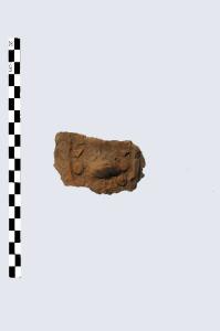 Frammento di parete con ansa, pertinente a vaso tronco-conico, prodotto in ceramica d'impasto grossolana, color bruno chiaro e superfici lisciate. Presenta una decorazione plastica costituita da 2 cordoni plastici rispettivamente a destra e sinistra dell'ansa e da 2 gruppi di 3 bugne parallele ai cordoni.