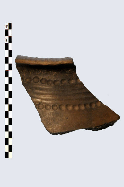 Frammento di orlo conparete, pertinente a olla, prodotta in ceramica d'impasto, color grigio scuro, avente orlo ampio ed appiattito superirmente ed esoverso, decorato da solcature parallele. Un'altra decorazione si trova sotto l'orlo ed è costituita da 2 file di coppellette separate da 4 solcature.