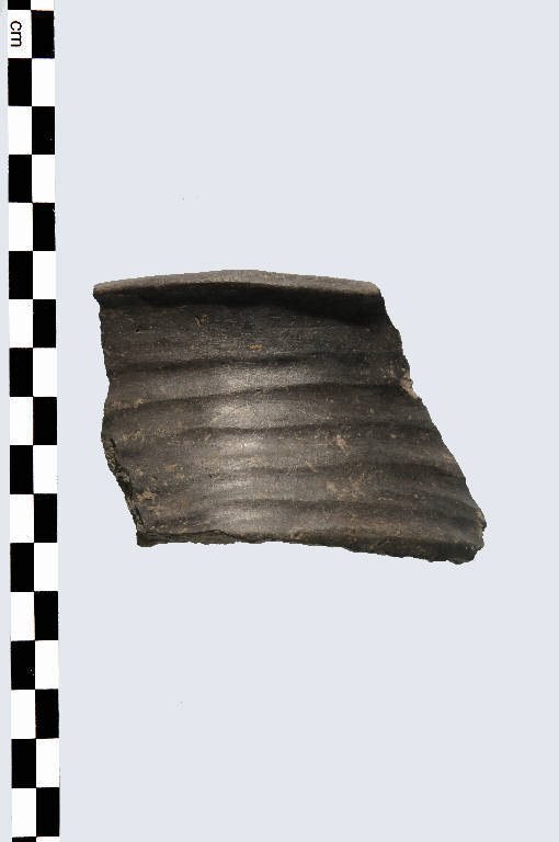 Frammento di orlo e parete, pertinente a vaso, prodotto in ceramica d'impasto grossolano, color grigio e superfici lisciate. L'orlo è leggermente esoverso. Presenta una decorazione sotto l'orlo costituita da solcature parallele.