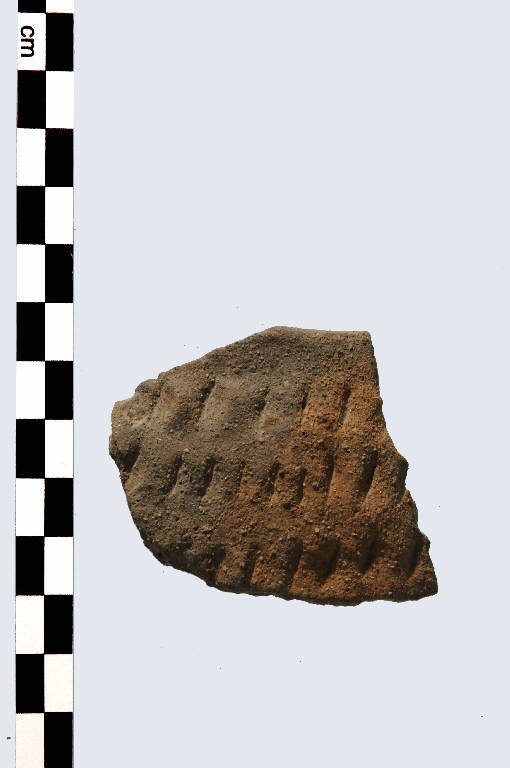 Frammento di orlo e parete, pertinente a vaso, prodotta in ceramica d'impasto grossolano con inclusi, color rossiccio, e superficie lisciate, avente orlo inclinato verso l'interno e decorato a tacche, la parete è decorata da fitte impressioni accostate.