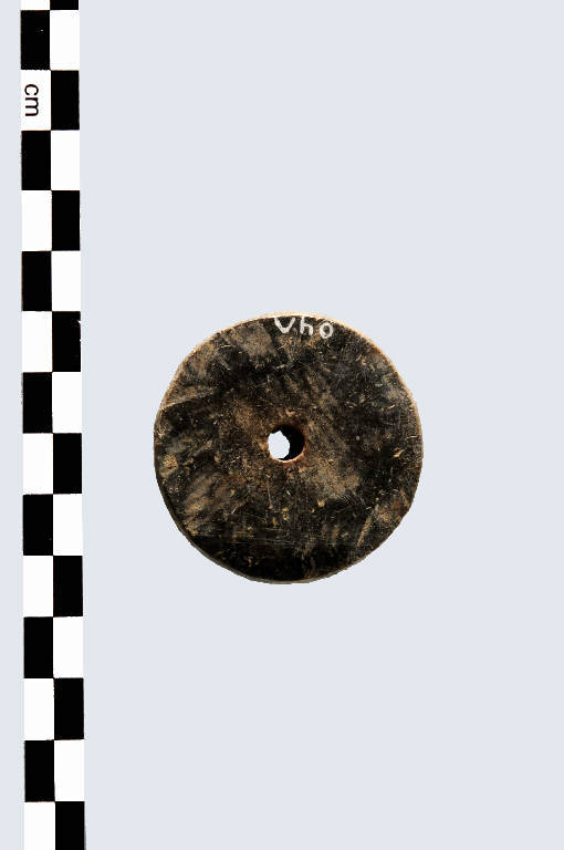 Manufatto, prodotto in osso, di tipo D, avente forma conica, faccia piana a profilo circolare, foro passante centrale e peduncolo cilindrico. Superficie levigata.
