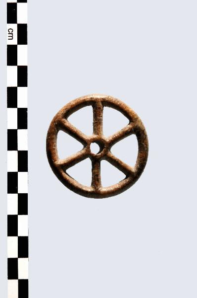 Manufatto, prodotto in osso-corno, tipo Redù, a ruota raggiata con 6 raggi e peduncolo cilindrico frammentario.