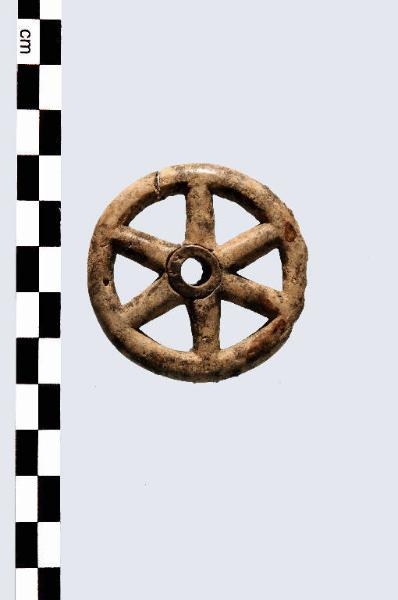 Manufatto, prodotto in osso-corno, tipo Redù, a ruota raggiata con 6 raggi e peduncolo cilindrico frammentario.