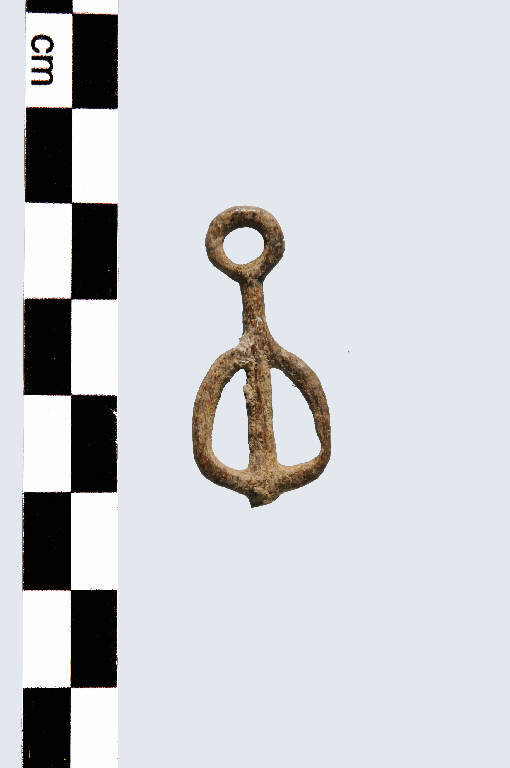 Manufatto di difficile interpretazione, prodotto in osso, frammentario, costituito nella parte superiore da una testa circolare con forellino passante, collo e corpo piriforme separate in due parti.