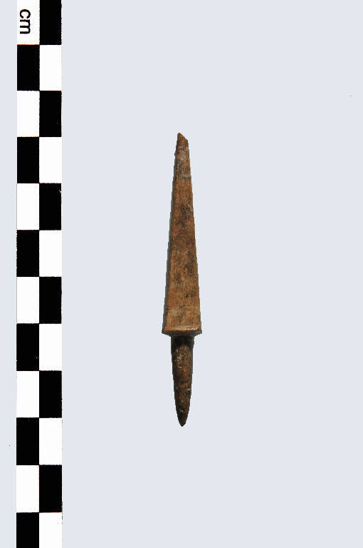 Punta di freccia tronco-piramidale, di tipo E, a sezione quadrangolare, con spigolo vivo tra punta e peduncolo fusiforme terminante a punta.