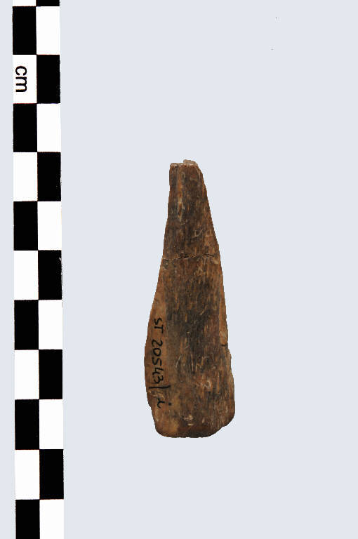 Spatola, di tipo A, a profilo approssimativamente triangolare, senza distinzione tra impugnatura e tagliente, estremità distale piatta.