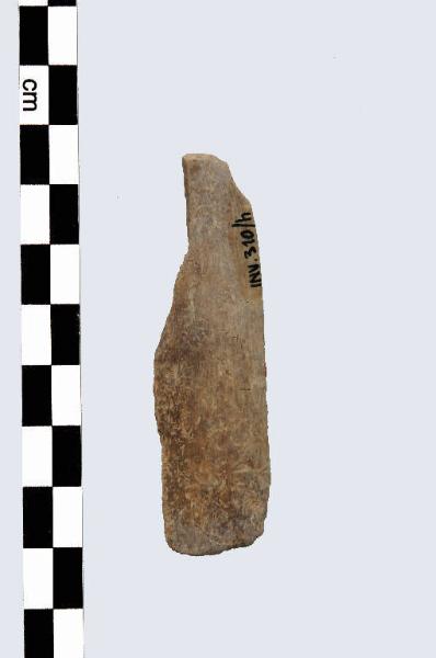 Spatola, di tipo A, a profilo approssimativamente triangolare, senza distinzione tra impugnatura e tagliente, estremità distale leggermente convessa. Frammentario.