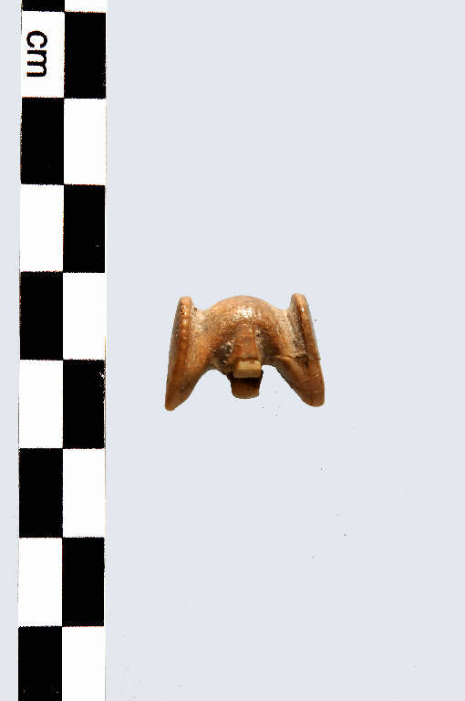 Pendaglio a forma di bipenne, con l'anello di sospensione spezzata. La superficie si mostra ben levigata.