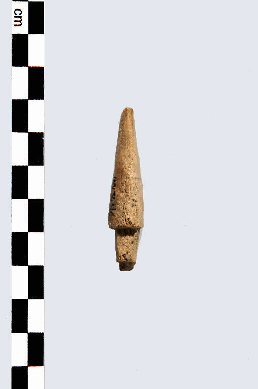 Punta di freccia fusiforme, di tipo E, a sezione circolare, con spigolo vivo tra punta e peduncolo cilindrico in parte mancante.