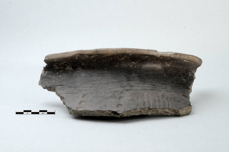 Frammento di orlo e parete, pertinente a vaso, prodotto in ceramica d'impasto grossolano, color grigio, e superfici lisciate, avente orlo appiattito superiormente. Presenta decorazione, sotto l'orlo, costituita da fasce di solcature irregolari parallele accostate; al di sotto tracce di tre coppelle in fila, interrotte da un gruppo di solcature.