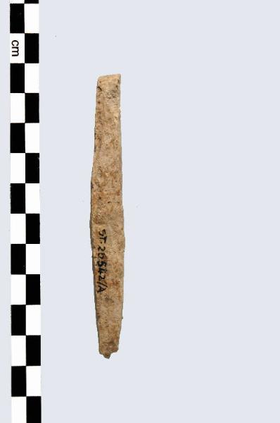 Manufatto, prodotto in osso, con estremità assottigliata, a sezione rettangolare, in parte lisciato.