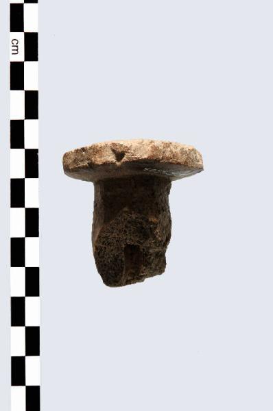 Manufatto, prodotto in corno, forse ancora in corso di lavorazione, con una parte discoidale a cui si innesta un elemento cilindrico. Entrambi sono piuttosto irregolari. Potrebbe trattarsi di una testa di ago crinale o rotella in corso di lavorazione, oppure un elemento pertinente all'immanicatura di un pugnale.