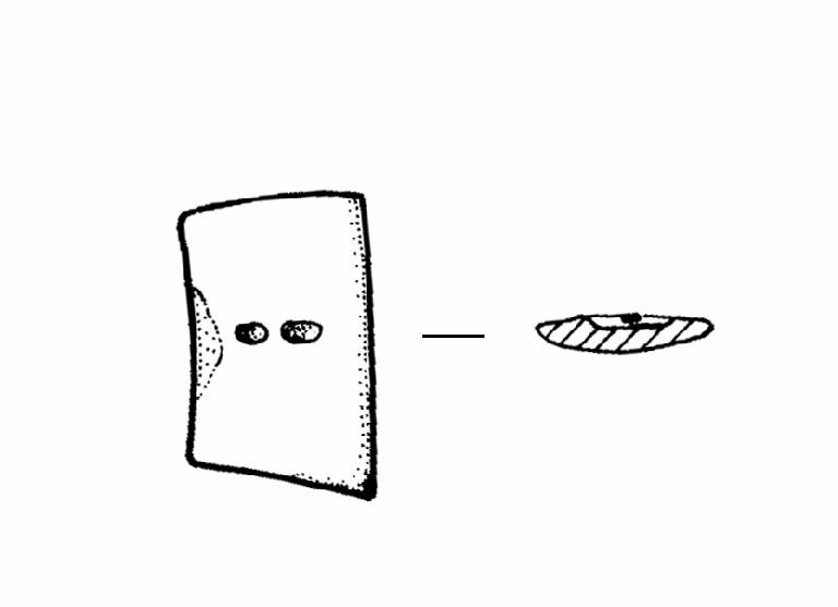 Forma trapezioidale a sezione piano-convessa. Al centro due forellini non passanti collegati.