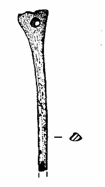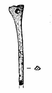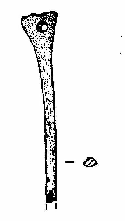 "Spillone" con base triangolare e foro passante circolare del tipo a "clessidra"; gambo con andamento corvilineo a sezione triangolare.