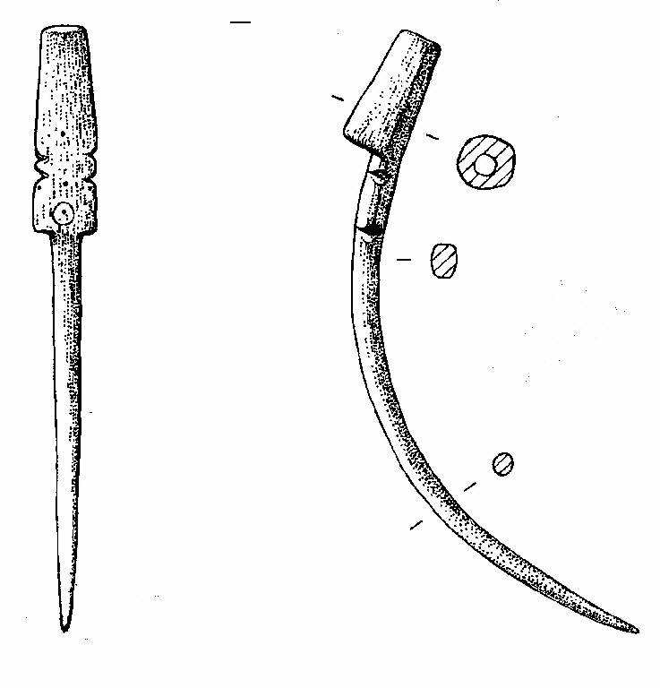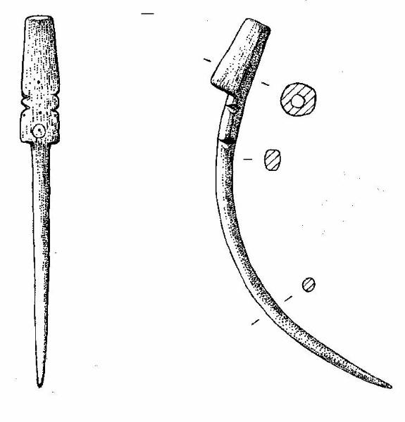 Spillone a testa conica laterale e gambo ricurvo. Capocchia leggermente rastremata verso l'apice a sezione sub-esagonale e foro longitudinale passante. Faccia posteriore decorata da quattro puntini ed un motivo a bersaglio. Raccordo con il gambo a sezione larga e piatta con tre tacche per lato. Gambo a sezione sub-circolare.