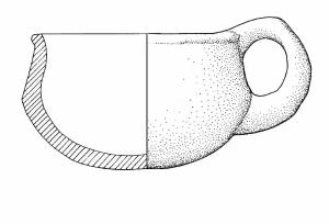 Corpo carenato. Orlo arrotondato lievemente estroflesso; parete distinta rastremata e rettilinea; vasca a calotta emisferica. Ansa a nastro leggermente soraelevata, impostata dall'orlo alla carena. Colore: grigio scuro.