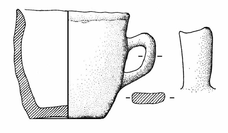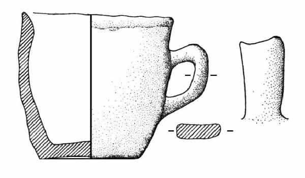 Orlo assottigliato obliquo verso l'interno; parete lievemente convessa; fondo concavo. Ansa a nastro lievemente insellata all'apice. Colore: Bruno nerastro.