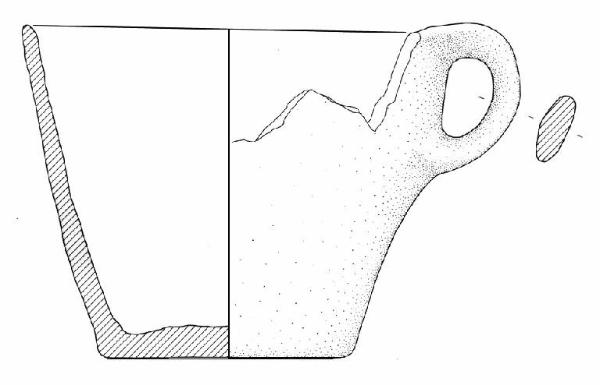 Orlo arrotondato, parete a profilo rettilineo, base piana con accenno di tacco. Ansa ad orecchio impostata all'orlo e lievemente sopraelevata. Colore grigio scuro.