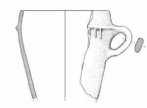 Orlo arrotondato, parete a profilo convesso. Ansa nastriforme ad orecchio. Cordone plastico orizzontale sul quale si imposta, all'attacco superiore dell'ansa, tre listelli plastici verticali. Colore: grigio-bruno.