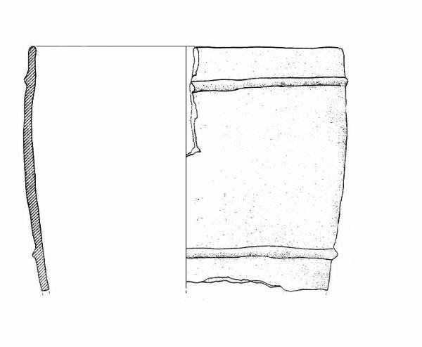 Orlo arrotondato, parete a profilo convesso sulla quale sono applicati due cordoni plastici orizzontali. Colore: grigio-bruno.