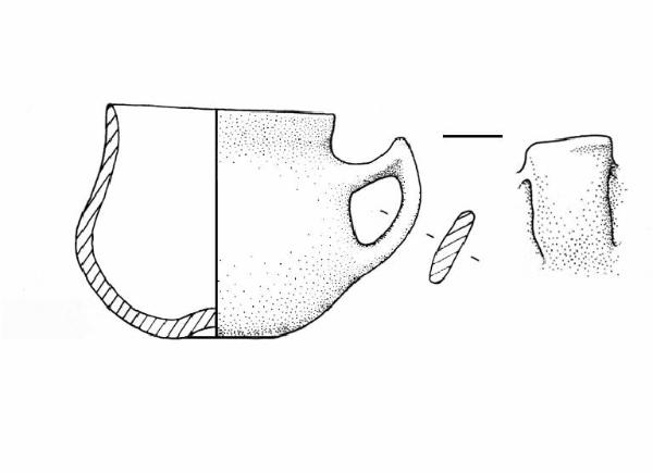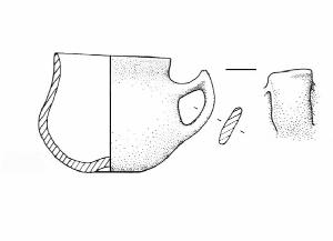 Orlo assottigliato, labbro leggermente esoverso, base convessa ombelicata. Ansa nastriforme a gomito con breve appendice asciforme. Colore: nero.