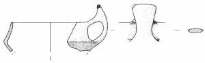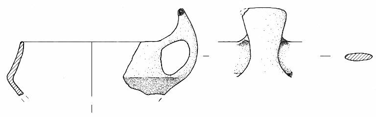 Ansa sopraelevata ad ascia. Orlo di forma arrotondata; parete distinta rettilinea rastremata verso l'orlo; vasca troncoconica. Colore: marrone scuro.