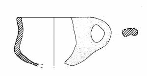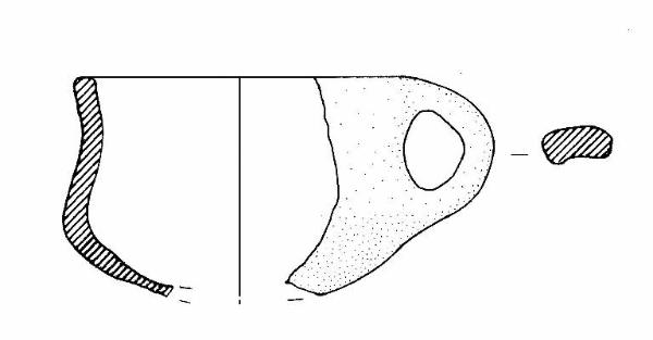 Corpo articolato. Orlo di forma piatta. Ansa nastriforme ad anello, lievemente insellata, impostata all'orlo e in corrispondenza del diametro massimo. Colore: grigio molto scuro.